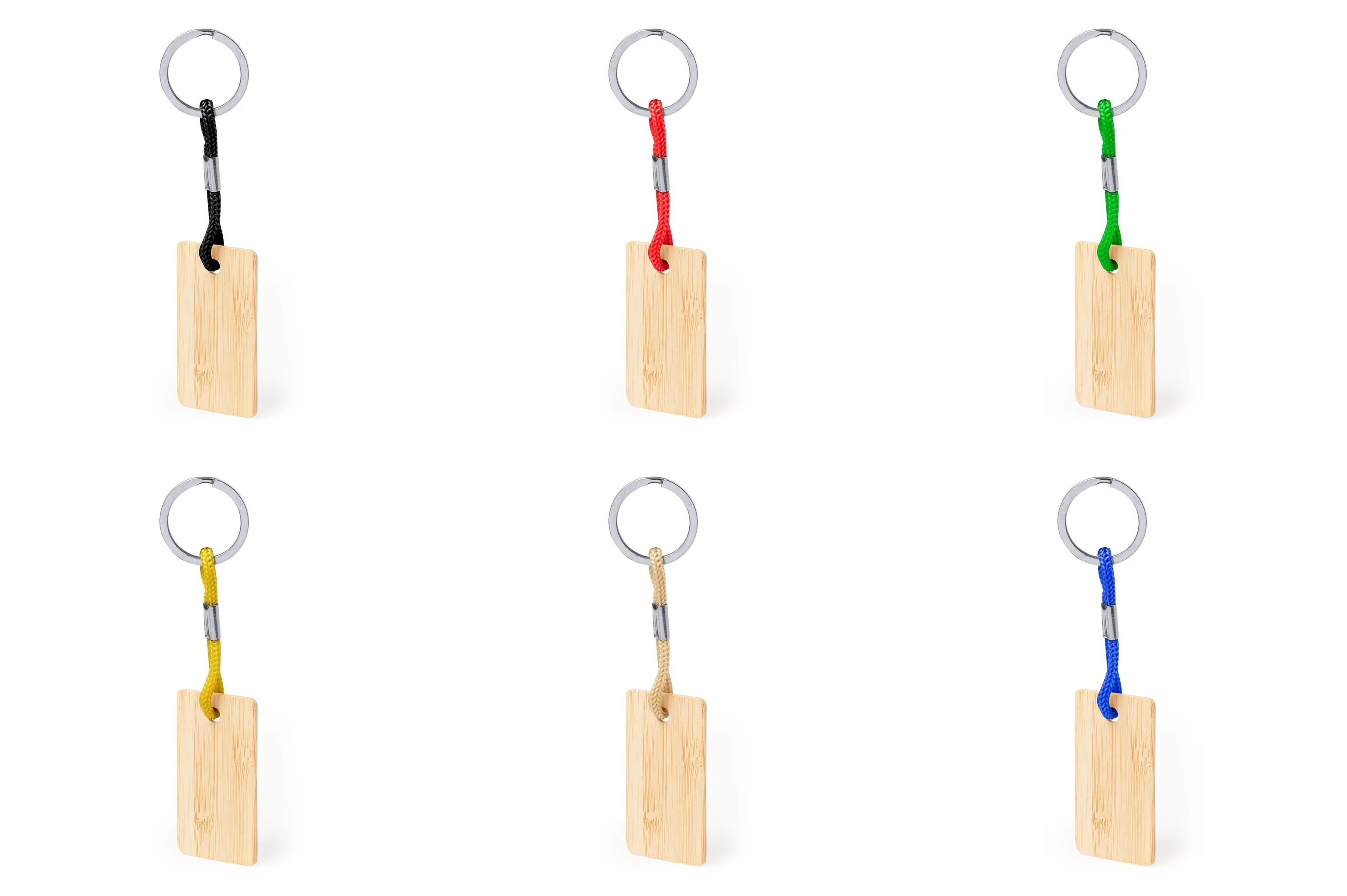 Práctico llavero rectangular, fabricado en bambú, con cordón en variados colores.