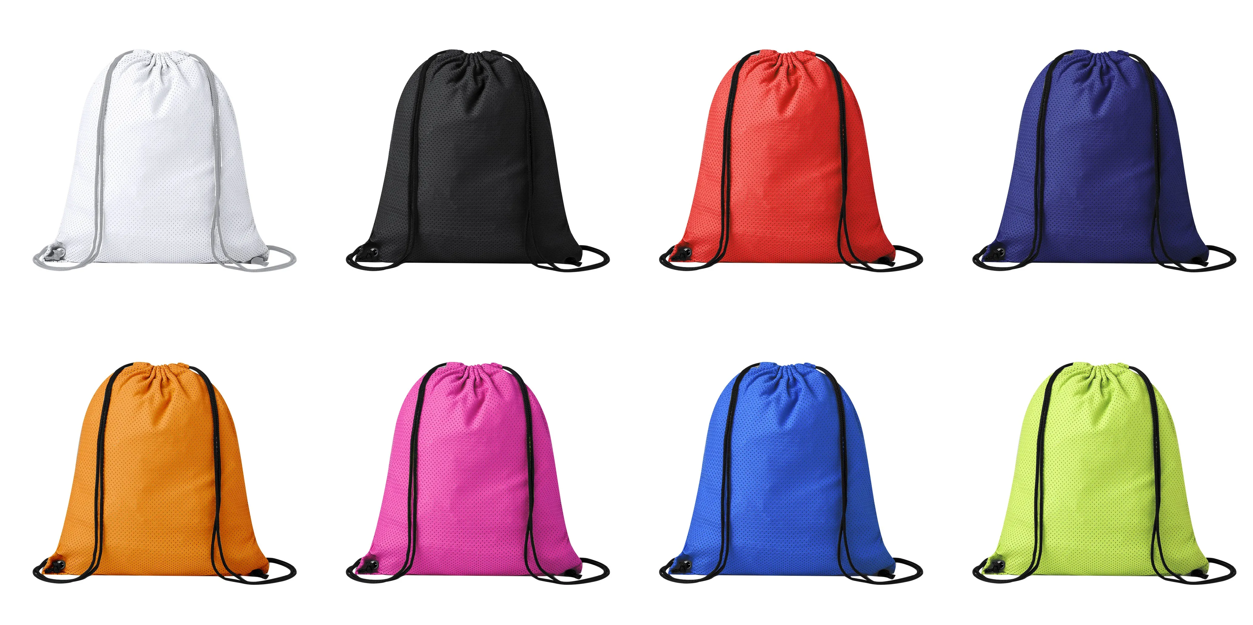 Mochila de cuerdas en suave poliéster. Posee cuerdas de autocierre y argollas metálicas de refuerzo. Disponible en variada gama de colores (color blanco especialmente fabricado para impresión en sublimación).