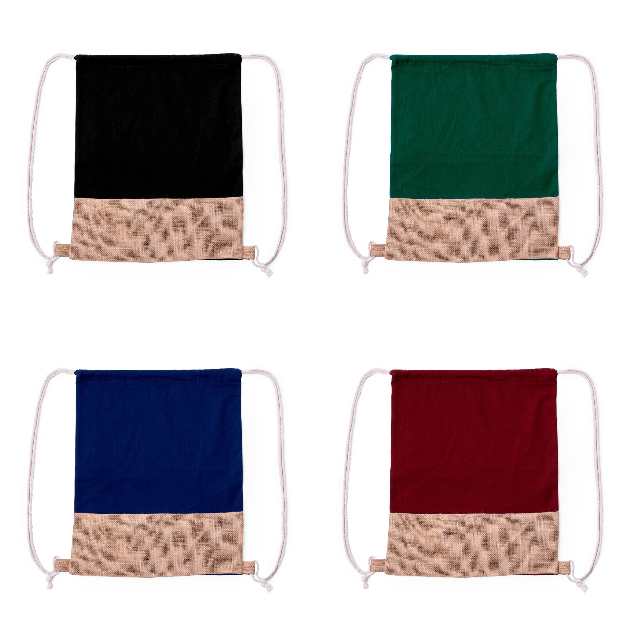 Mochila de cuerdas en material 100% algodón de 120 g/m2 en combinación con yute. Cuerdas autocierre en algodón en blanco con argollas de yute en la base. Disponible en diversos colores. Resistencia hasta 8kg de peso.
