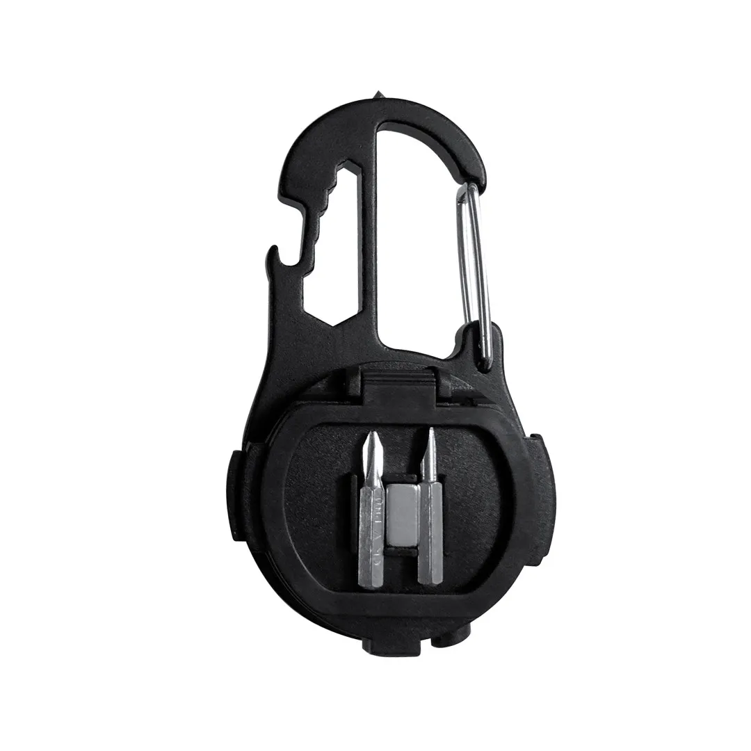 Práctica multiherramienta fabricada en resistente aluminio de acabado en negro y 12 funciones. Con linterna de 20 luces COB y 3 posiciones de iluminación: luz fija con dos grados de intensidad y luz intermitente; y alimentada por una batería de 500 mAh. Incluye llaves para tuercas hexagonales en varios tamaños, abridor, y martillo rompe cristales. Con función destornillador (incluidas puntas planas y philips) y un potente imán. Práctico mosquetón de enganche y soporte en la parte trasera. Con cable de carga incluido y presentado en caja de diseño kraft.