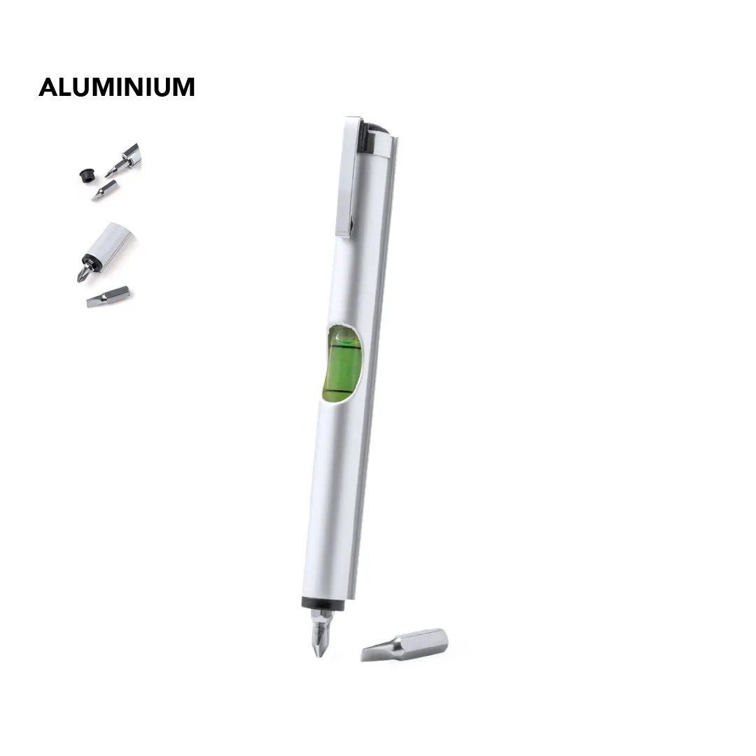 Práctica multiherramienta fabricada en aluminio, con nivel integrado en el cuerpo y dos cabezales para destornillador (plano y philips) en el interior. Con clip metálico de acabado cromado y presentada en caja de diseño kraft.