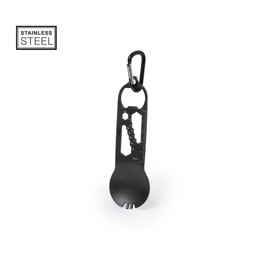 Completa multiherramienta con 16 funciones en acero inox. Incluye: mosquetón para transportarlo fácilmente, zona plana función destornillador, abrebotellas, regla de hasta 5 cm en un lateral, parte central para tuercas de 11 medidas diferentes (desde 1/4 hasta 11) y práctica cuchara con dientes para uso de tenedor. Presentada en una bolsa individual.
