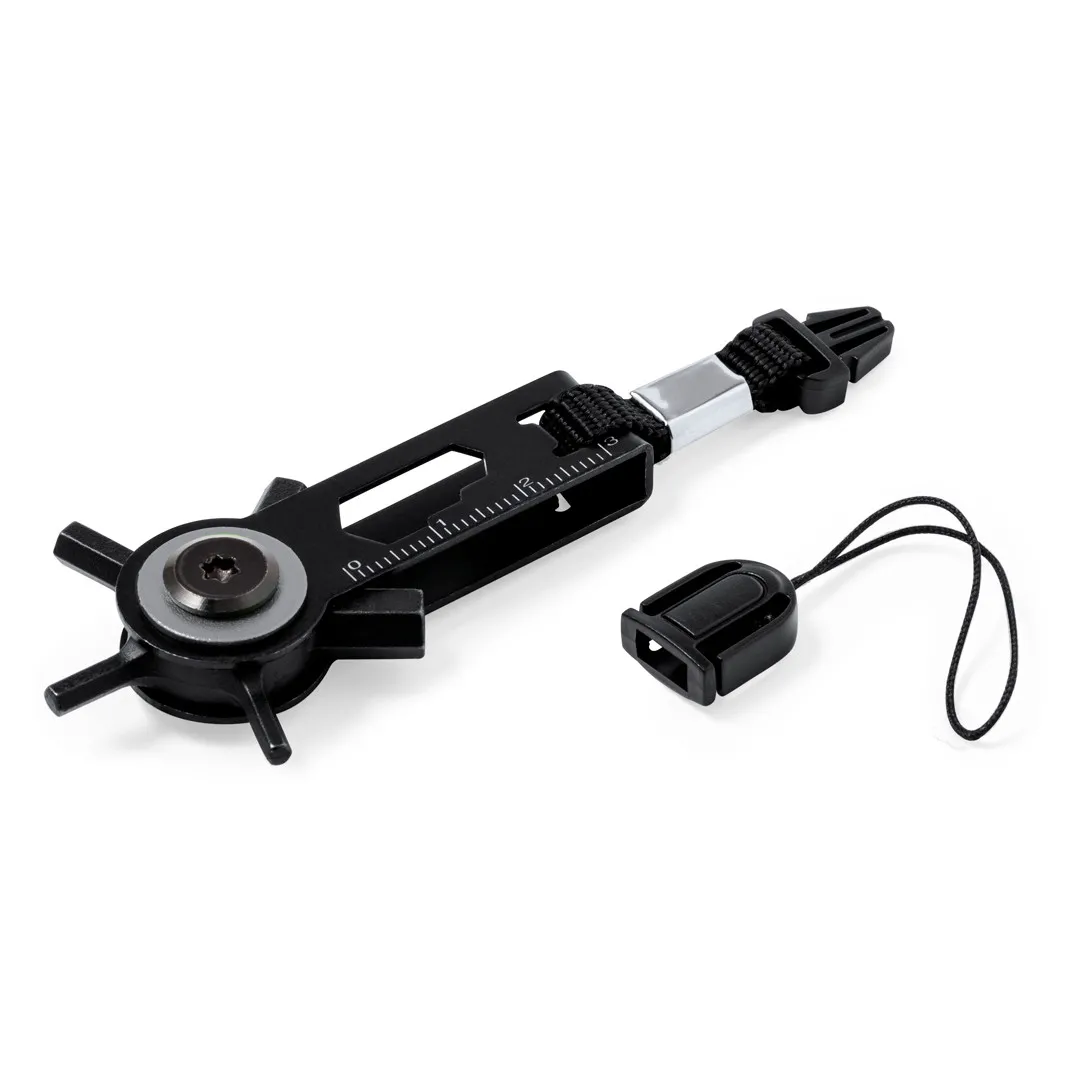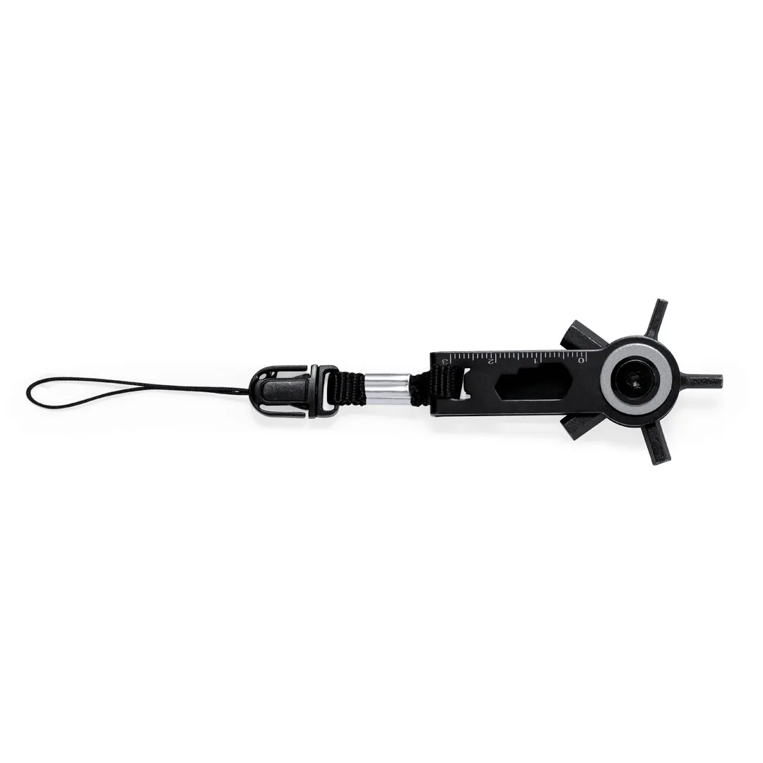 Eficaz multiherramienta con cabezal giratorio fabricada en acero inox y acabado en negro. Con 10 funciones: llaves allen, llave para tuercas hexagonales en varios tamaños, regla y un práctico accesorio de transporte con cierre de hebilla. Presentado en bolsa de papel reciclada de diseño kraft.