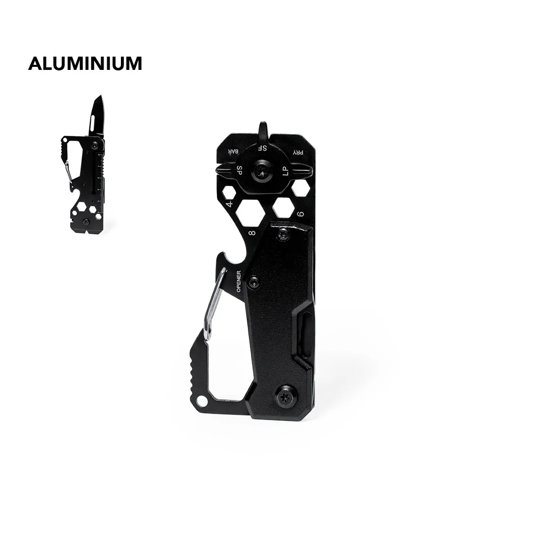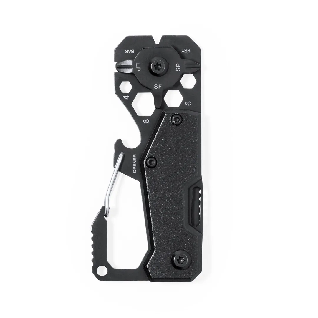 Excelente multiherramienta fabricada en aluminio y acero inox con acabado en color negro. Incluye 13 funciones diferentes: llave para tuercas hexagonales en varios tamaños, mosquetón, abrelatas, regla, rasqueta, cuchillo, destornilladores planos y philips. Presentada en caja de diseño kraft.