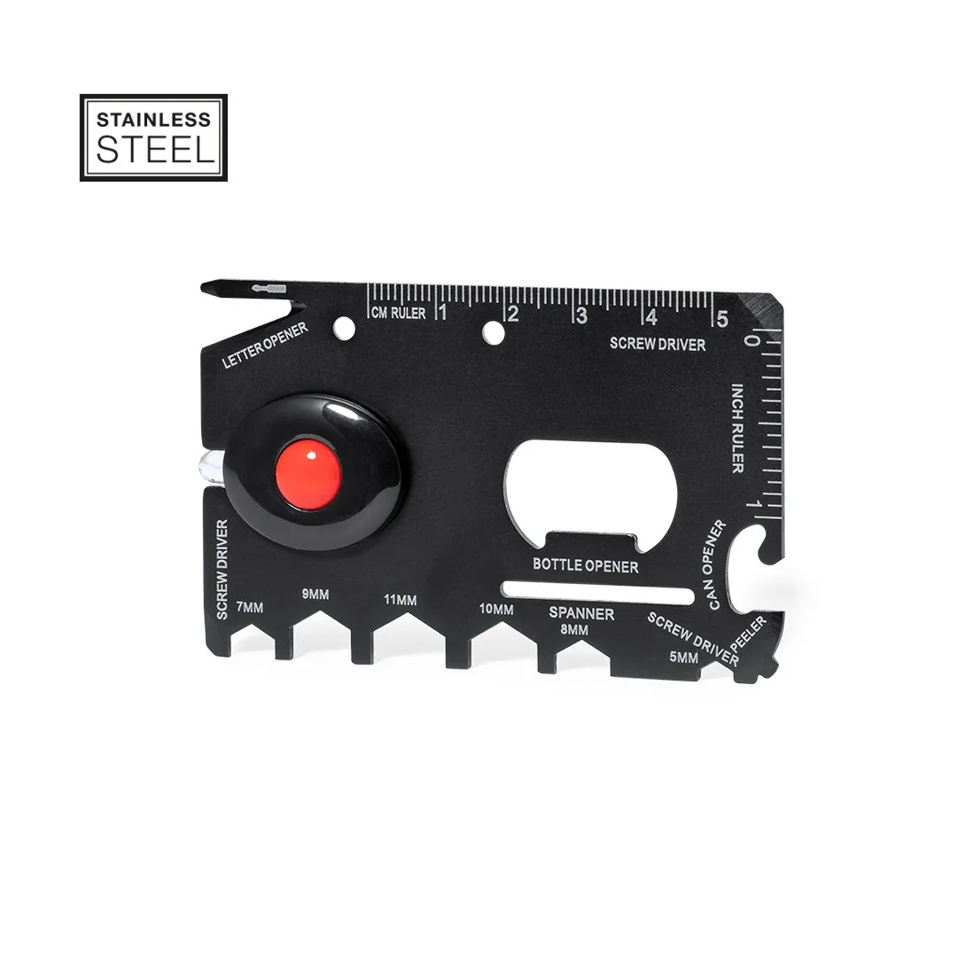 Práctica multiherramienta fabricada en acero inox y acabado en negro. Diseño plano en forma de tarjeta y con 16 funciones: destornilladores planos, abridor de cartas, regla en cm y pulgadas, abridor de botellas, abrelatas, pelador, llave para tuercas hexagonales en varios tamaños y linterna (pila de botón incluida). Presentada en bolsa individual diseño en papel reciclado.