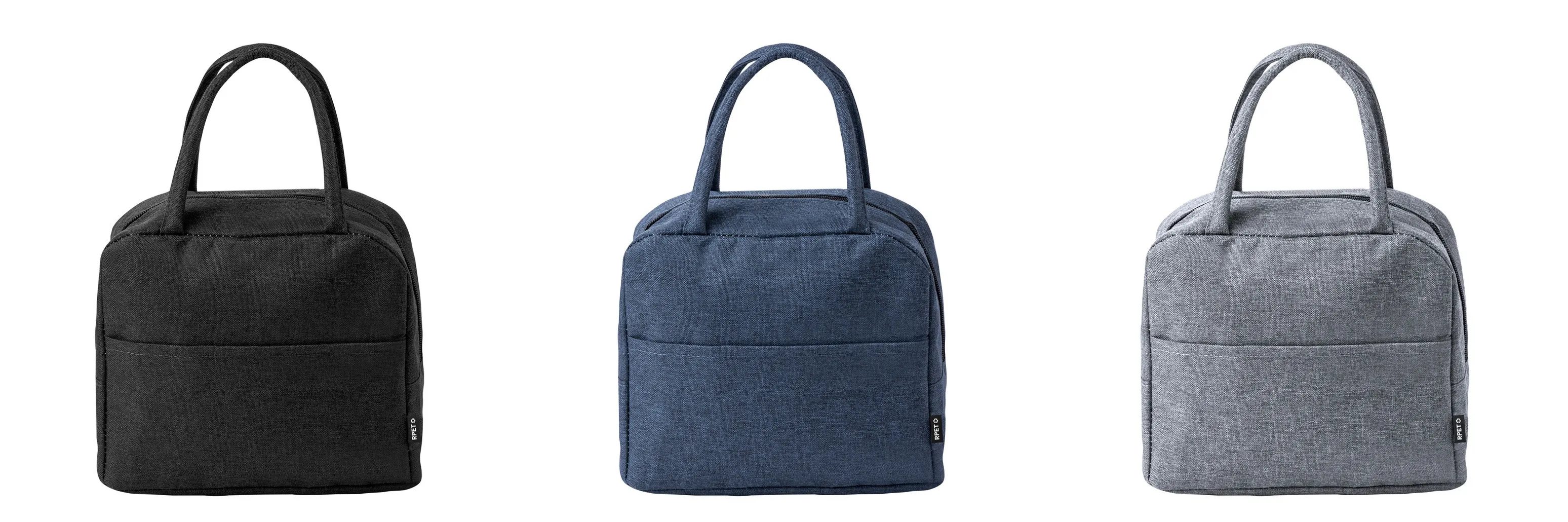 Nevera confeccionada en resistente poliéster 600D RPET. Compartimento principal con cierre de cremallera e interior en aluminio con base reforzada. Incluye bolsillo exterior y asas a conjunto, con logotipo RPET en etiqueta exterior.