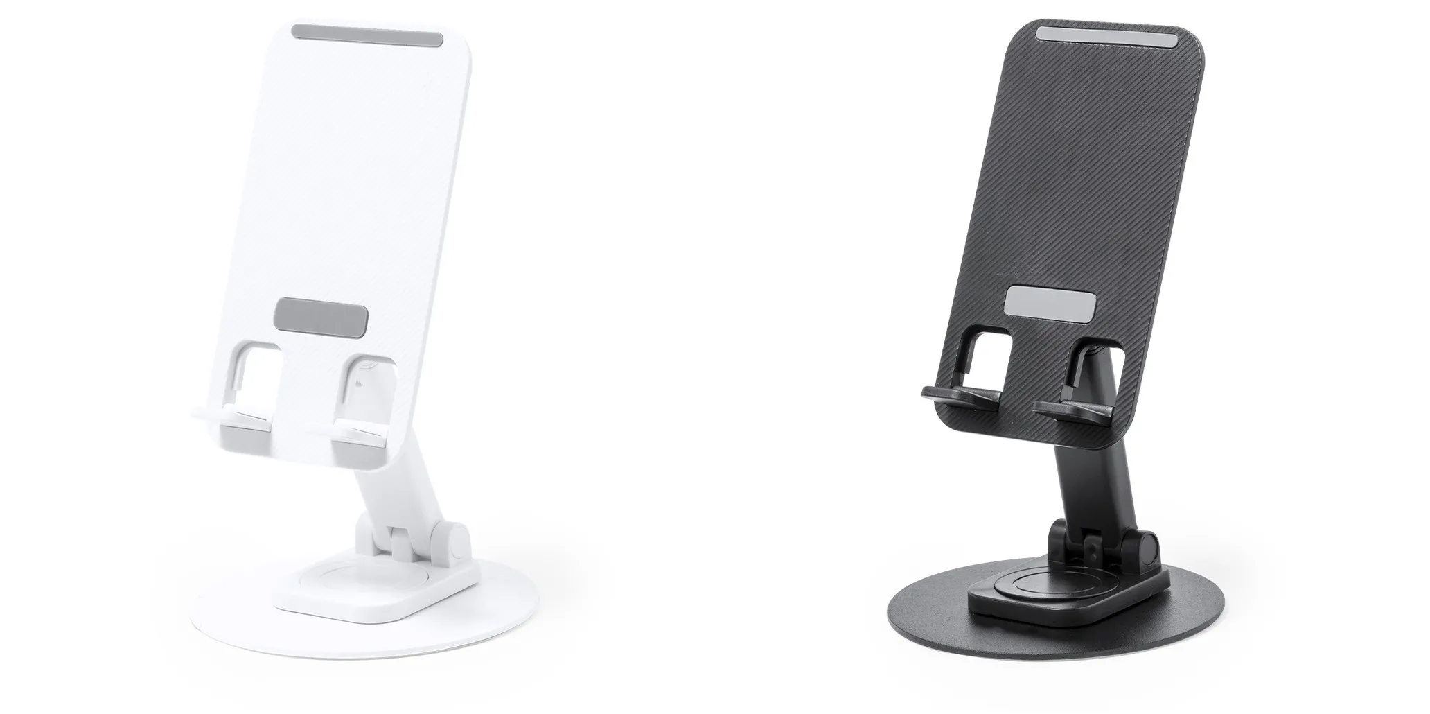 Soporte plegable para smartphone y tablet, fabricado en resistente aluminio y ABS. Regulable en altura, con almohadillas de goma antideslizantes en base y soporte. En sobrio acabado de color blanco o negro, y con amplia superficie de marcaje. Presentado en atractiva caja de diseño.