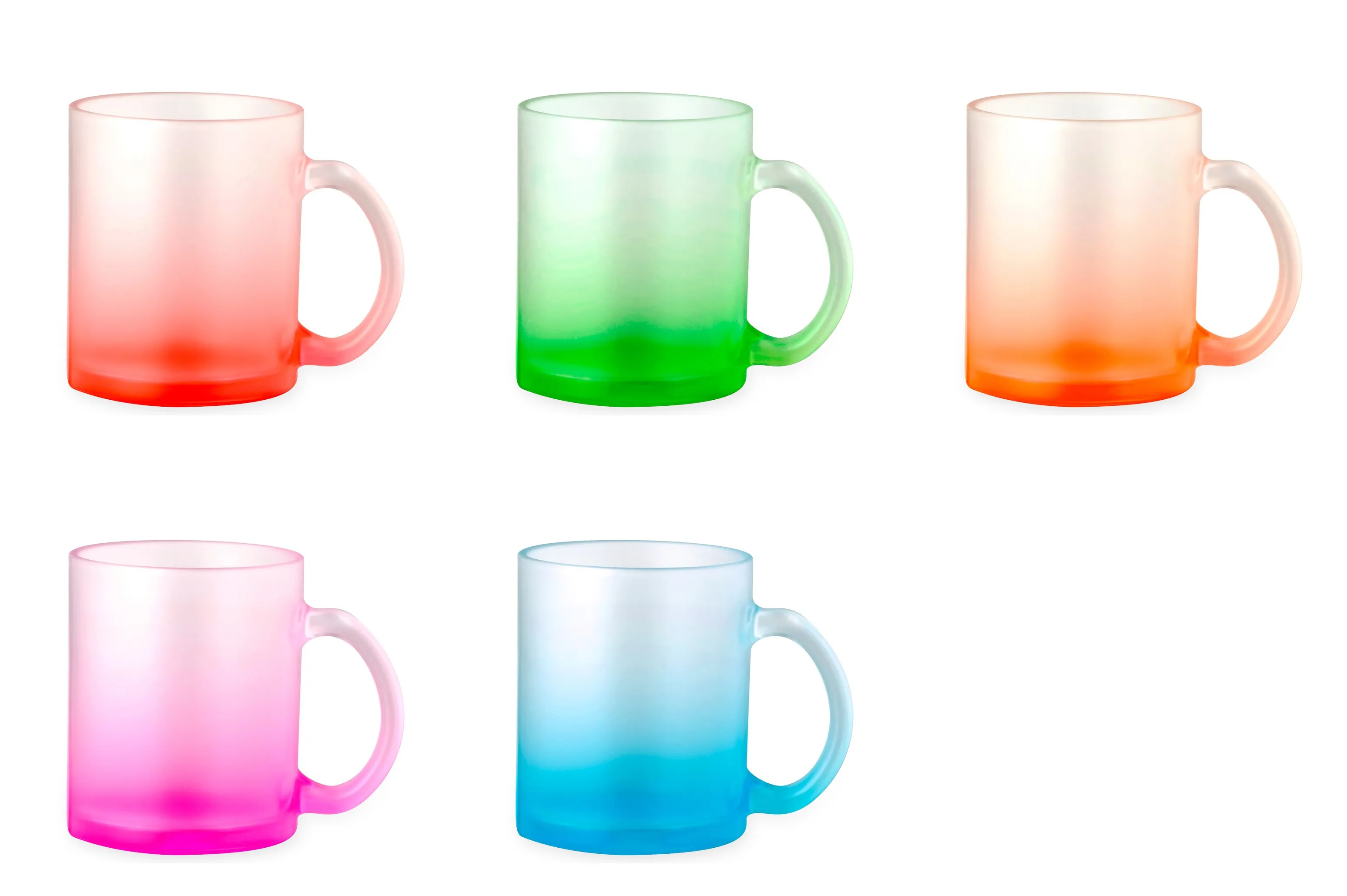 Taza de cristal de acabado mate de 350 ml de capacidad. Especialmente diseñada para la sublimación. Disponible en diversos y llamativos colores translúcidos y presentada en caja individual kraft.