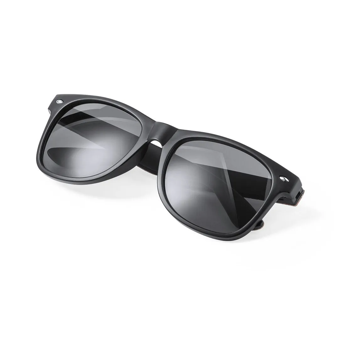 Gafas de sol de línea nature con protección UV400. Montura negra en resistente material PC, con lentes tintadas a juego y patas con recubrimiento de corcho natural. Presentadas en atractivo estuche de diseño eco.