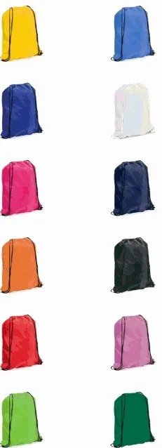 Mochila de cuerdas en suave poliéster 210T de alegres colores y extensa gama de colores. Con cuerdas autocierre en color negro y esquinas con argollas metálicas y refuerzo de polipiel a juego.