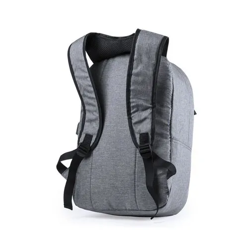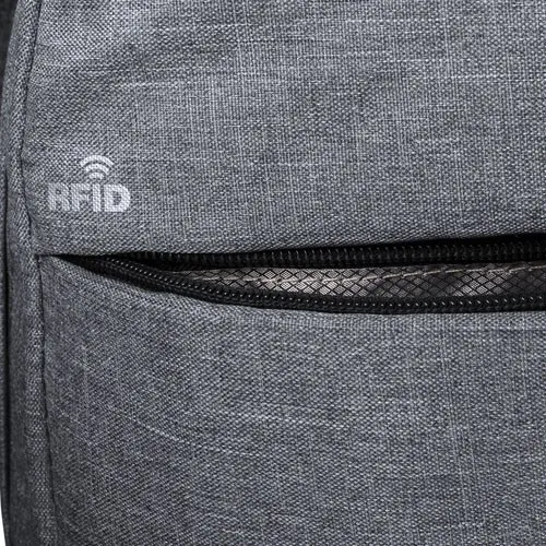 Mochila de seguridad, con diseño urbano en resistente poliéster 300D. Bolsillo interior con protección de seguridad RFID (Identificación por Radio Frecuencia) que mantiene seguros los datos de la tarjeta y demás dispositivos. Compartimento principal con elegante tapeta en la cremallera. Con conexión USB -powerbank no incluido- y bolsillo interior acolchado para ordenador portátil de hasta 15 pulgadas. Parte trasera y cintas acolchadas.