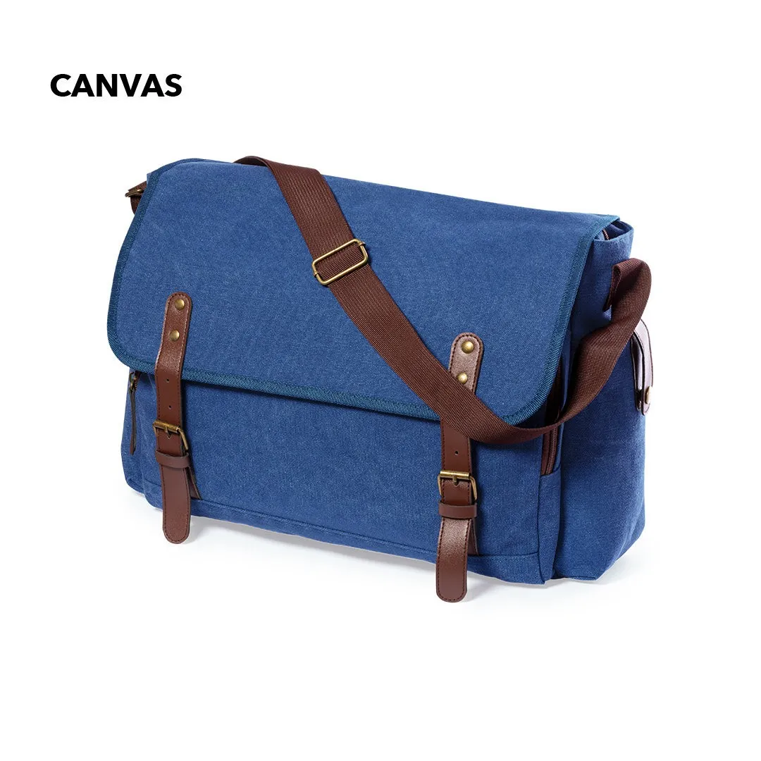 Portadocumentos bandolera de diseño atemporal, fabricado en resistente canvas de 480g/m2, con cintas de cierre en polipiel y práctica cinta para hombro ajustable.